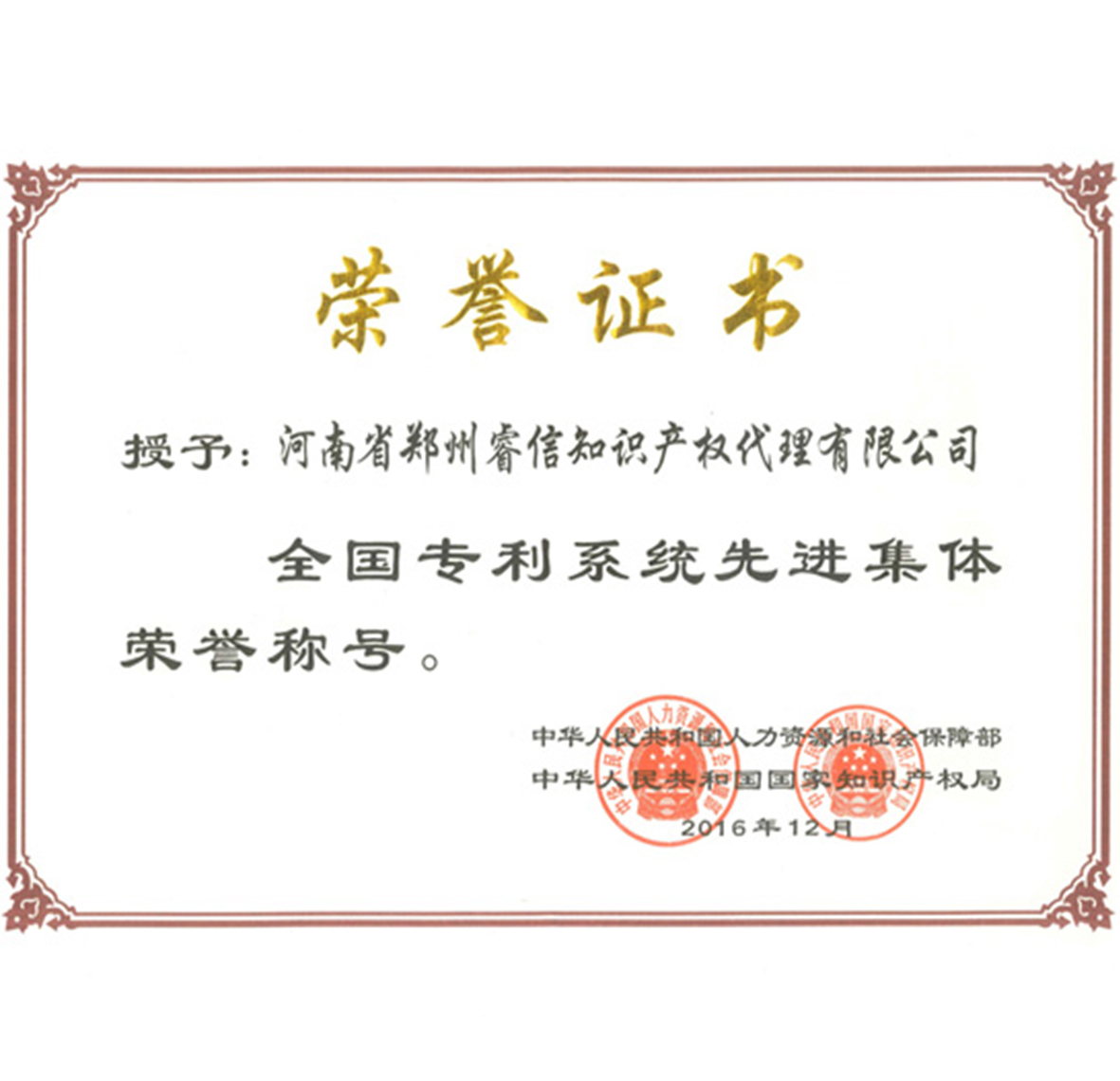 公司榮獲河南省知識(shí)產(chǎn)權(quán)系統(tǒng)先進(jìn)集體稱號(hào)。